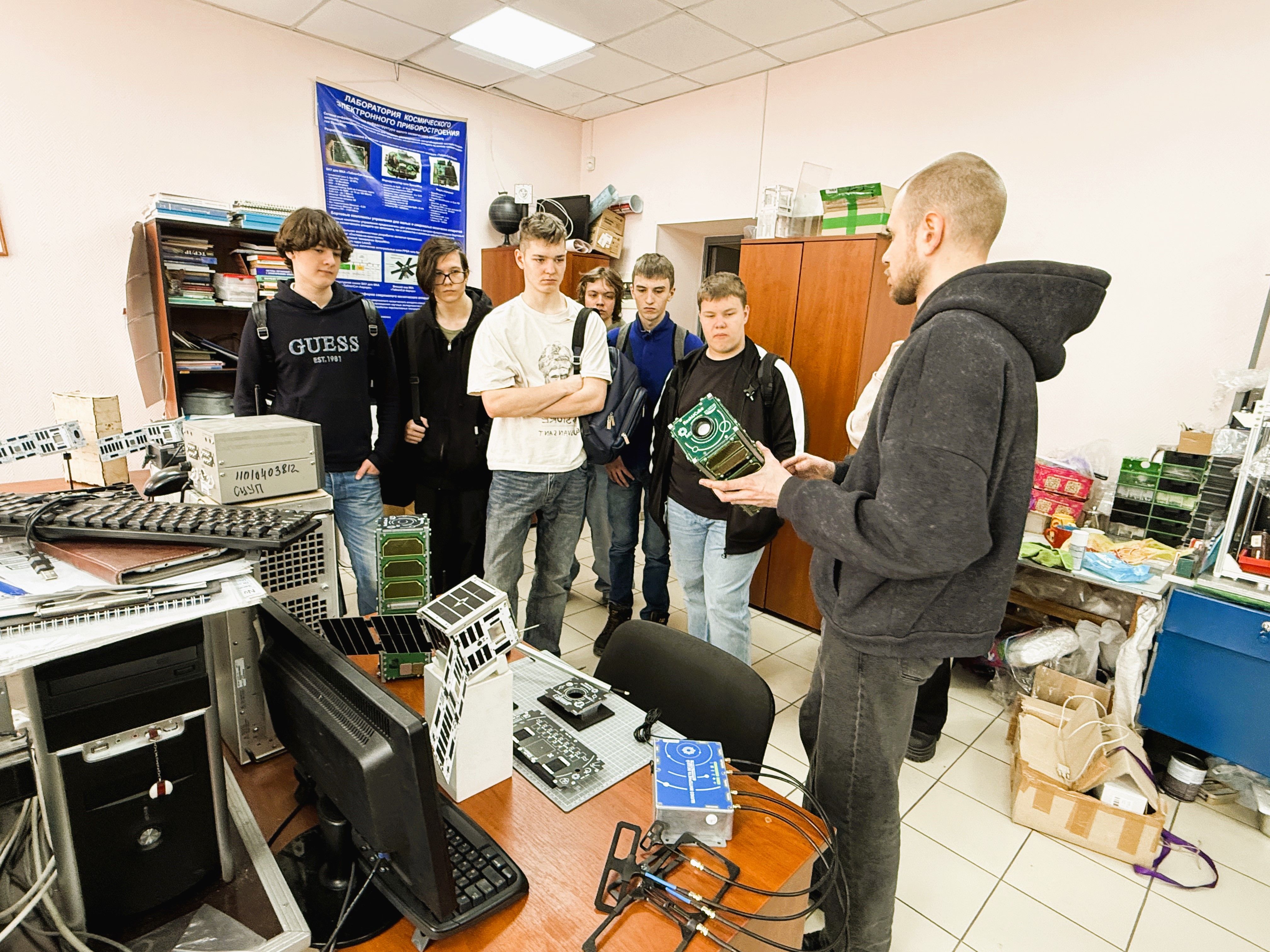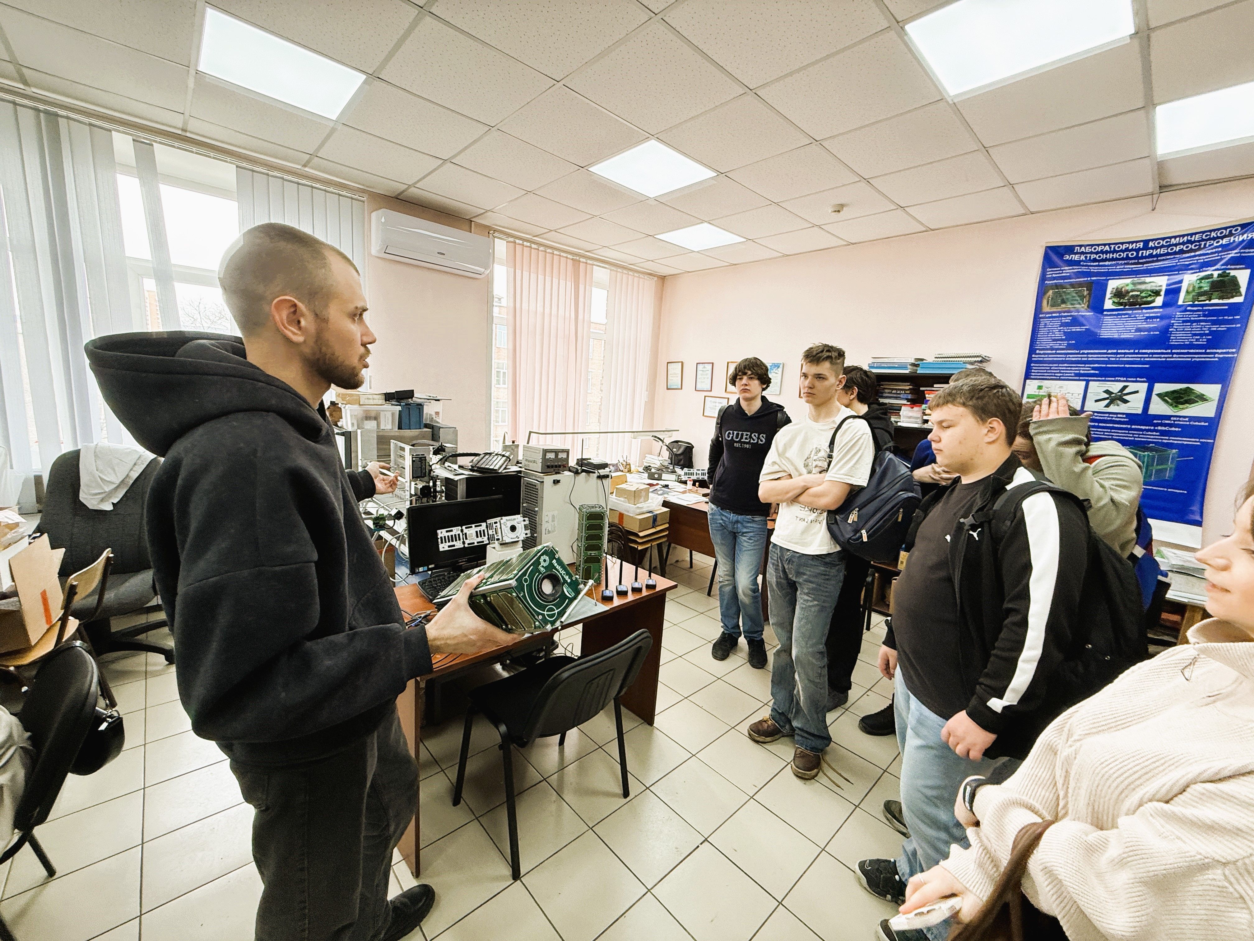 В конце экскурсии школьникам показали макеты кубсатов. Ученики не только увидели реальные прототипы МКА серии ReshUCube, но и узнали об их технических характеристиках, назначениях и возможностях.