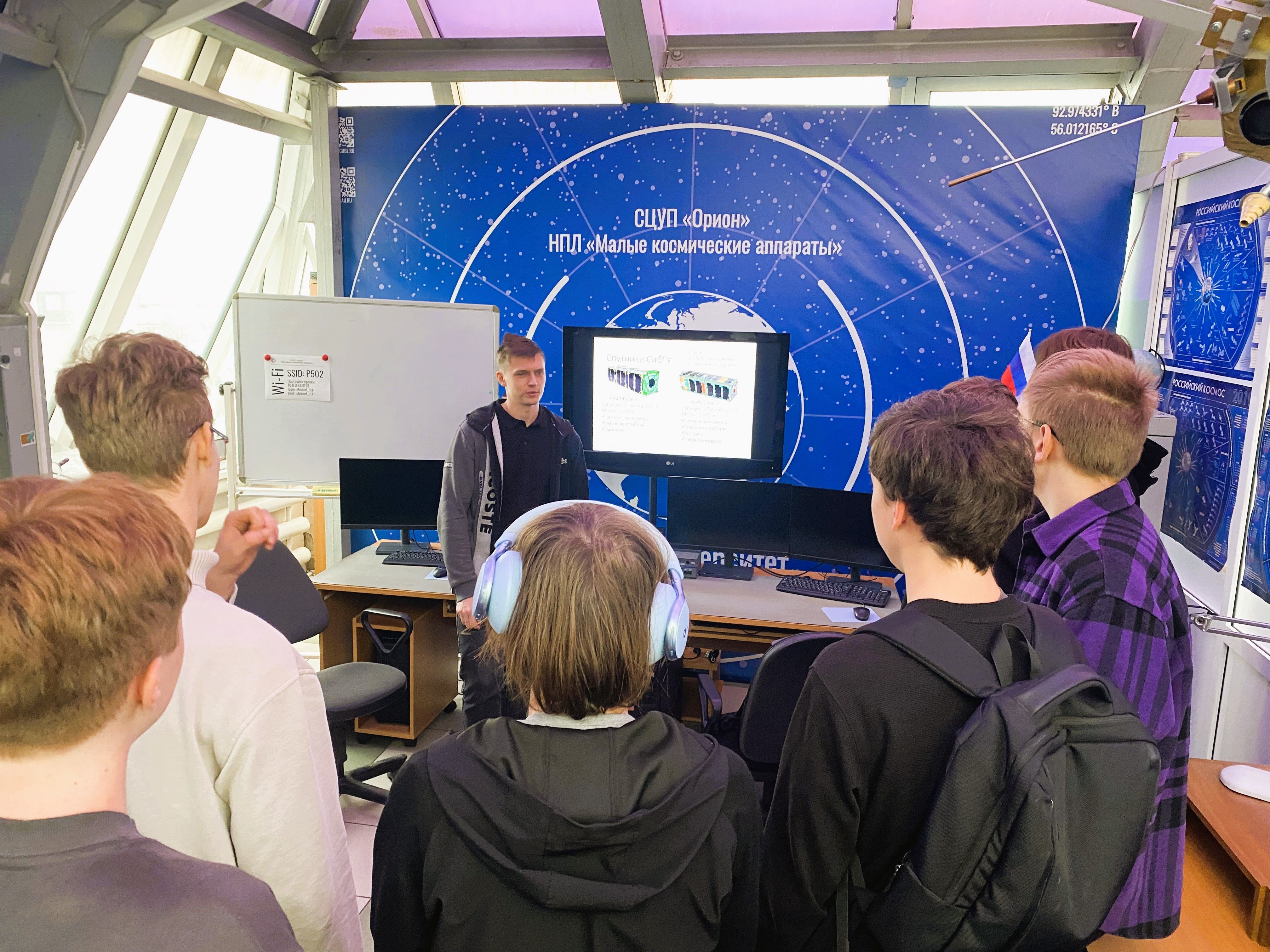 Экскурсия началась с вводной лекции в ЦУПе. Школьникам рассказали, как работают спутники, какими они бывают и какова их роль в жизни человека. Они познакомились с разработанными в университете МКА ReshUCube: с ReshUCube-1 и ReshUCube-2, которые уже выведены на орбиту, а также с ReshUCube-3, миссия которого только планируется.