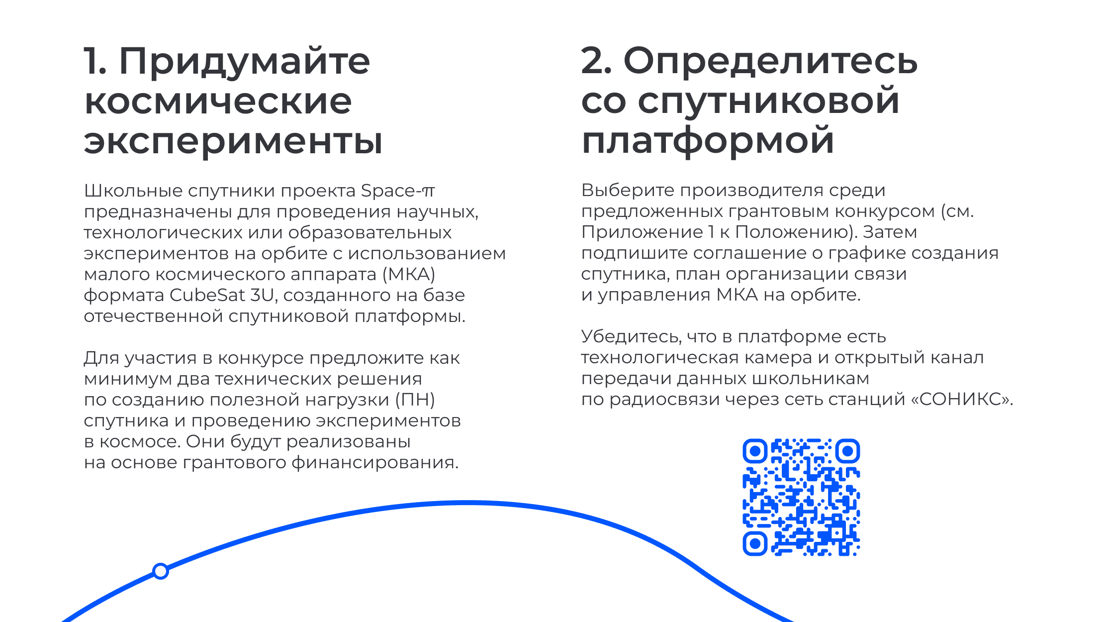 Для участия в конкурсе предложите как минимум два технических решения по созданию полезной нагрузки (ПН) спутника и проведению экспериментов в космосе. Они будут реализованы на основе грантового финансирования.