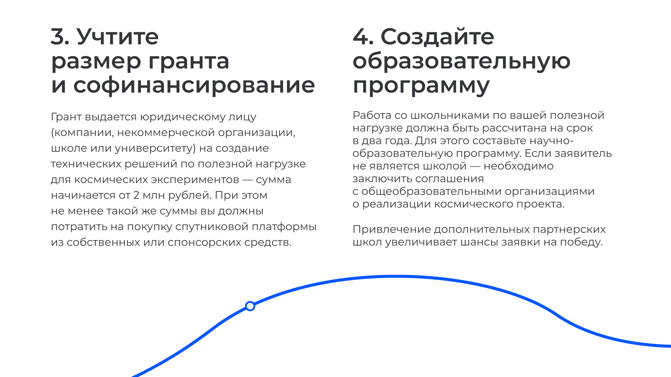 Грант выдается юридическому лицу (компании, некоммерческой организации, школе или университету) на создание технических решений по полезной нагрузке для космических экспериментов — сумма начинается от 2 млн рублей. При этом не менее такой же суммы вы должны потратить на покупку спутниковой платформы из собственных или спонсорских средств.