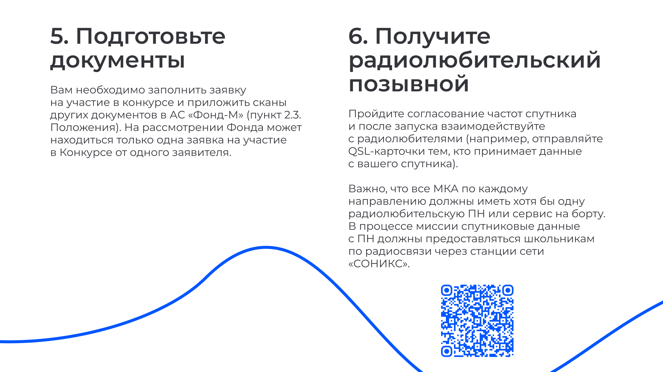 Если вы выиграли грант, пройдите согласование частот спутника и после запуска взаимодействуйте с радиолюбителями (например, отправляйте QSL-карточки тем, кто принимает данные с вашего кубсата).