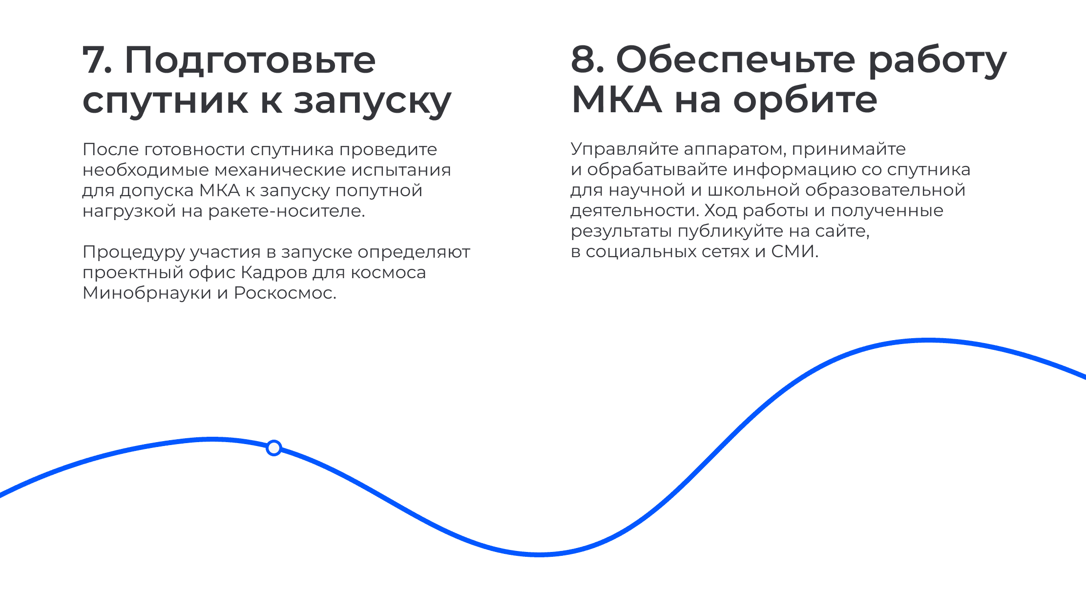 Работа со школьниками по вашей полезной нагрузке должна быть рассчитана на срок в два года. Для этого составьте научно-образовательную программу. Если заявитель не является школой — необходимо заключить соглашения с общеобразовательными организациями о реализации космического проекта.
