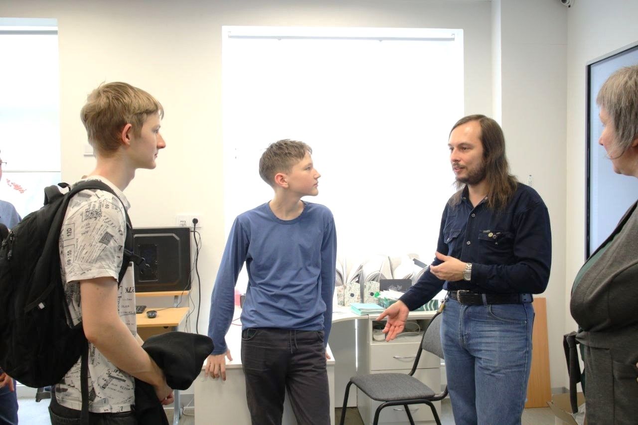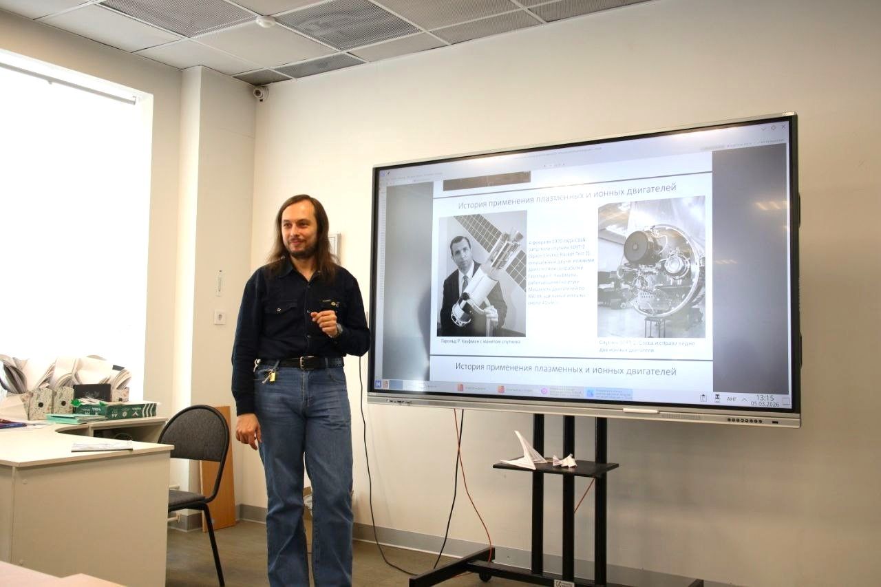 Главный инженер-конструктор Игорь Егоров провёл с ребятами тематическую беседу, посвящённую сложным аспектам маневрирования космическими аппаратами при помощи электрореактивных двигателей.